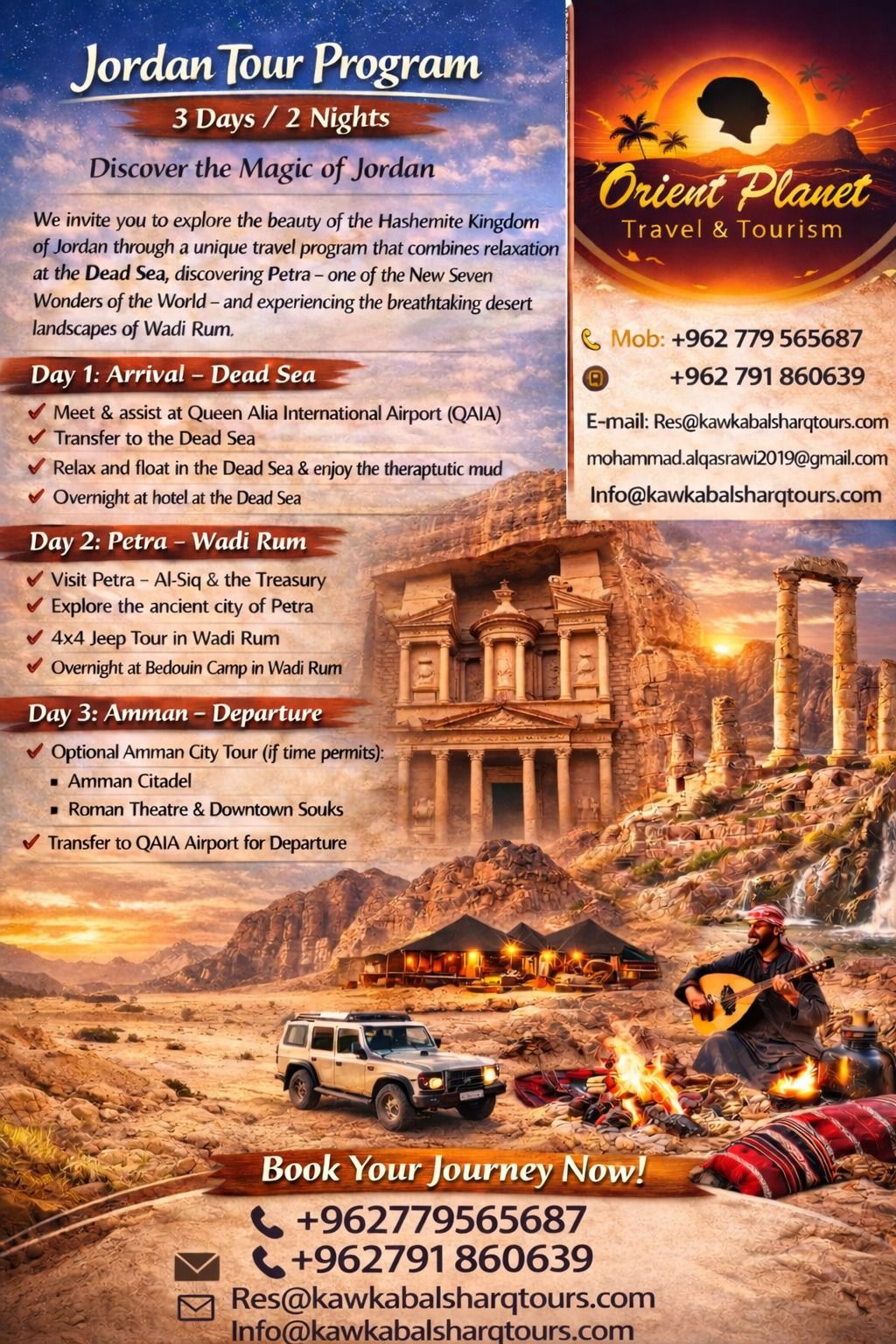 We invite you to explore the beauty of the Hashemite Kingdom of Jordan through a unique travel program that combines relaxation at the Dead Sea, discovering Petra – one of the New Seven Wonders of the World – and experiencing the breathtaking desert landscapes of Wadi Rum. A complete program designed to offer comfort, adventure, and unforgettable memories.