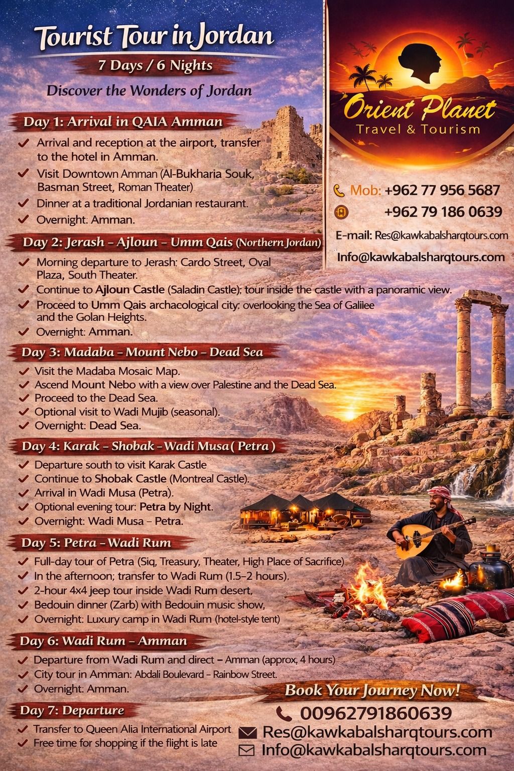 | Wadi Rum: Sultana Camp, Oasis Camp, Mazayen Rum Camp | 4 Stars | Breakfast & Dinner |